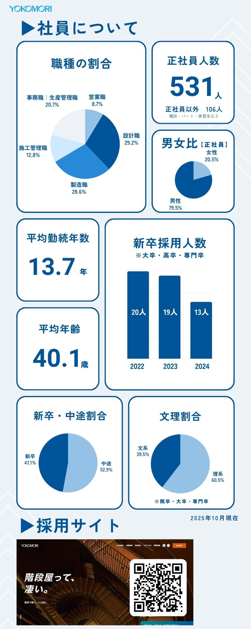 2025.10.01 社風・オフィス環境 データで見るヨコモリ 2025.10.01 社風・オフィス環境 若手社員の一日 2025.10.01 社風・オフィス環境 「kai」で口コミチェック! 2025.10.01 社風・オフィス環境 採用Q&A 2025.10.01 社風・オフィス環境 生産工場のご紹介