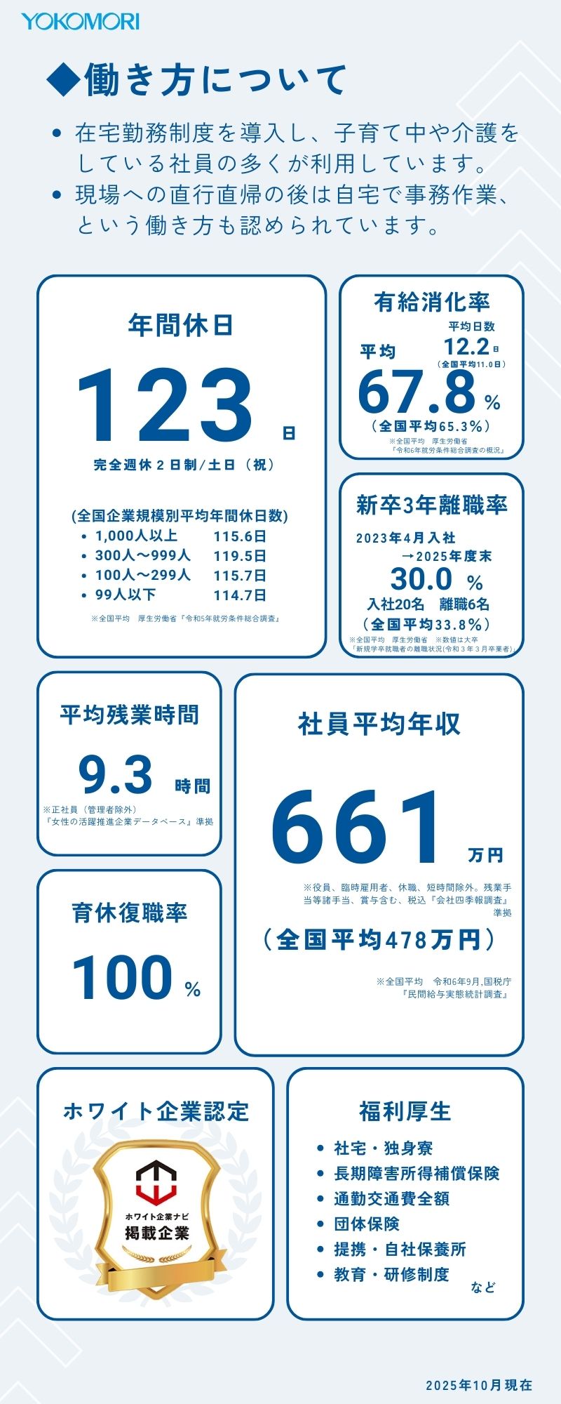 2025.10.01 社風・オフィス環境 データで見るヨコモリ 2025.10.01 社風・オフィス環境 若手社員の一日 2025.10.01 社風・オフィス環境 「kai」で口コミチェック! 2025.10.01 社風・オフィス環境 採用Q&A 2025.10.01 社風・オフィス環境 生産工場のご紹介